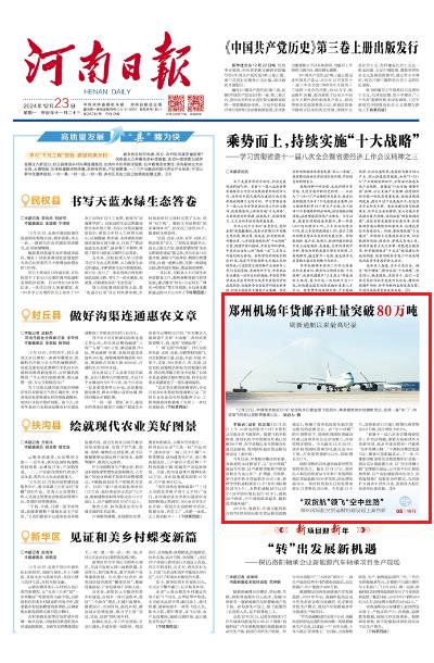河南日報 | 鄭州機場年貨郵吞吐量突破80萬噸