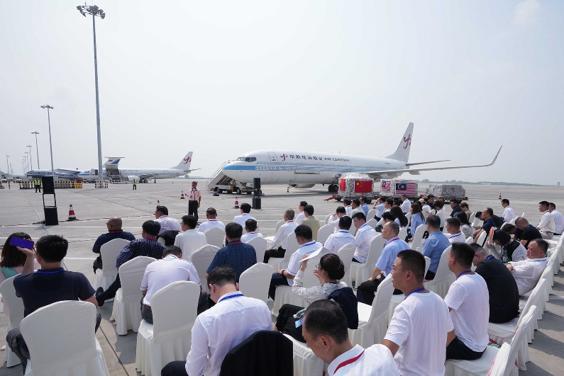 8月25日上午,吉隆坡-鄭州鮮食榴蓮首航接機儀式在鄭州機場舉行,馬來西亞首批鮮食榴蓮進入中國市場,中馬航空貨運樞紐項目加速推進。中豫航空集團黨委書記、董事長張明超,總經理、黨委副書記、副董事長柳建民;馬來西亞駐華大使館工作人員,馬來西亞榴蓮廠商公會代表和榴蓮貿易供應鏈企業代表參加了儀式。