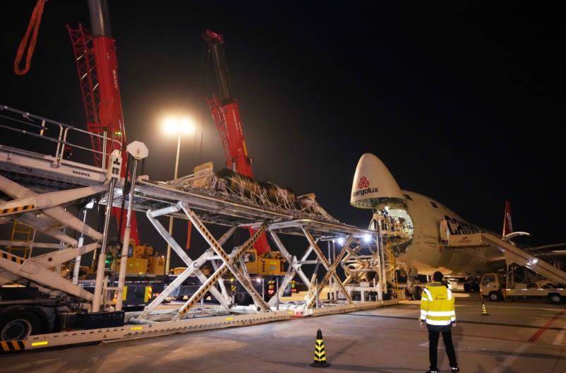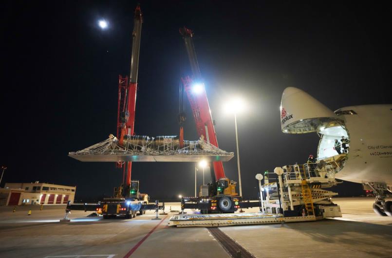 12月14日下午5點26分,一架盧森堡貨航的B747全貨機將一件不可拆裝、單件重達51噸的貨物順利運抵鄭州,經過停機坪上繁忙有序的配合,裝載至平板卡車安全駛離停機坪,再次刷新鄭州機場單件最重貨物保障紀錄。