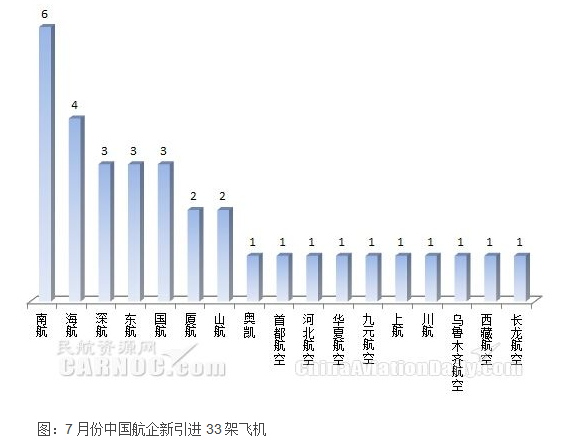 根據民航數據分析系統CADAS,2016年7月份中國大陸航空公司新引進飛機33架。其中南航引進飛機數量最多,為6架;機型方面,737-800飛機數量最多,為16架。